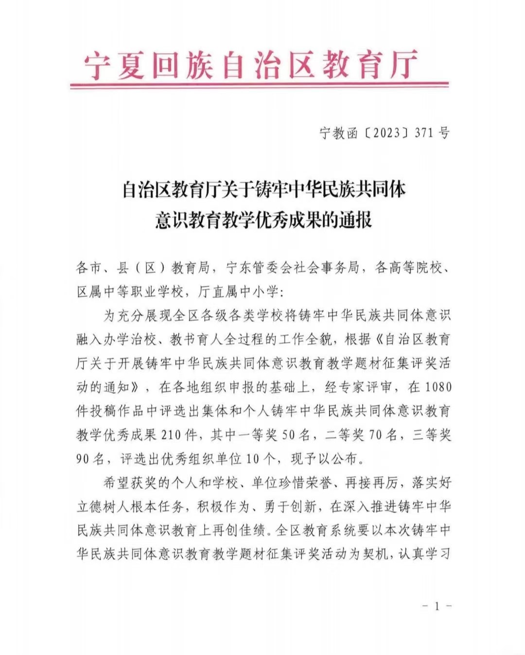 近日,自治区教育厅发布了《关于铸牢中华民族共同体意识教育教学优秀成果的通报》(宁教函〔2023〕371号),对全区各级各类学校铸牢中华民族共同体意识教育教学题材征集评奖活动结果公布,由澳门永利皇宫