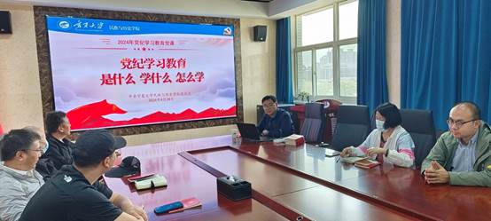 学习会强调,开展党纪学习教育是以习近平同志为核心的党中央作出的重大决策部署,是加强党的纪律建设,推动全面从严治党向纵深发展的重要举措,各党支部和广大党员教师要提高政治站位,认真学习领会,主动对标,坚决把思想和行动统一到党中央决策部署上来。要以习近平新时代中国特色社会主义思想为指导,准确把握开展党纪学习教育的目标要求,进一步强化纪律意识、加强自我约束,增强政治定力、纪律定力、道德定力、抵腐定力,始终做到忠诚干净担当。要通过个人自学与集中学习相结合,理论学习中心组、支委会、党小组、读书班、党员学习会等方式,逐章逐条学习新修订的《中国共产党纪律处分条例》,切实做到学懂弄通、熟练掌握。要以案促学,开展好警示教育,用好以案说纪、以案说法、以案说责 “活教材”。要注重贯通融合,把党纪学习教育和党性教育、廉政教育、师德师风建设、“四风”顽瘴痼疾专项整治统筹起来一体推进、一起抓,把党的纪律转化为党员干部的日常习惯和自觉遵循,使党纪学习教育成为促进学院学科建设、教学科研高质量发展的有效举措。