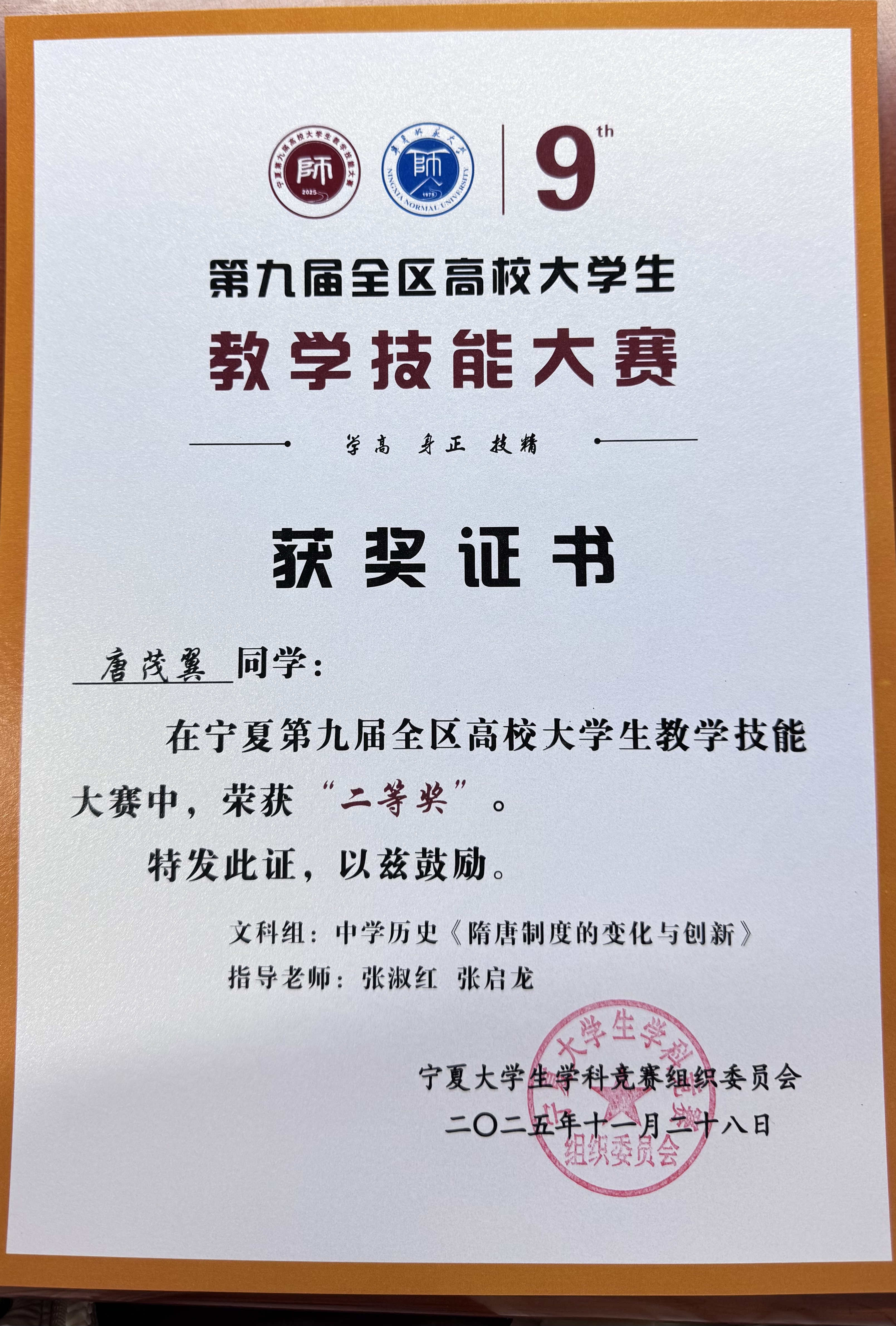 2025年11月15日,宁夏第九届全区高校大学生教学技能大赛决赛在宁夏师范学院圆满落幕。永利皇宫赌场 22级历史学(师范)专业本科生唐茂翼同学经过院赛、校赛的层层选拔,作为永利皇宫赌场 历史学科唯一晋级决赛的选手,凭借《隋唐制度的变化与创新》一课的扎实表现,荣获文科组(中学历史)二等奖,指导教师张淑红、张启龙荣获优秀指导教师奖。
